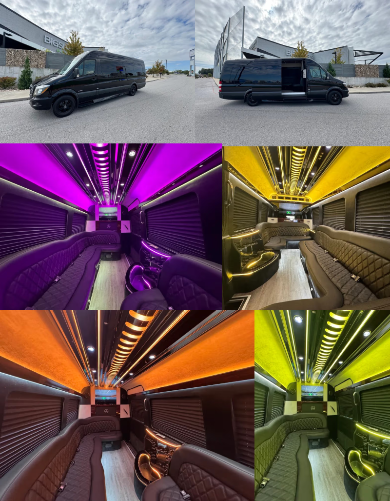 This premium luxury van offers spacious seating, LED lighting, a high-end sound system, tinted windows, and a smooth ride ideal for groups of 10–14 passengers.